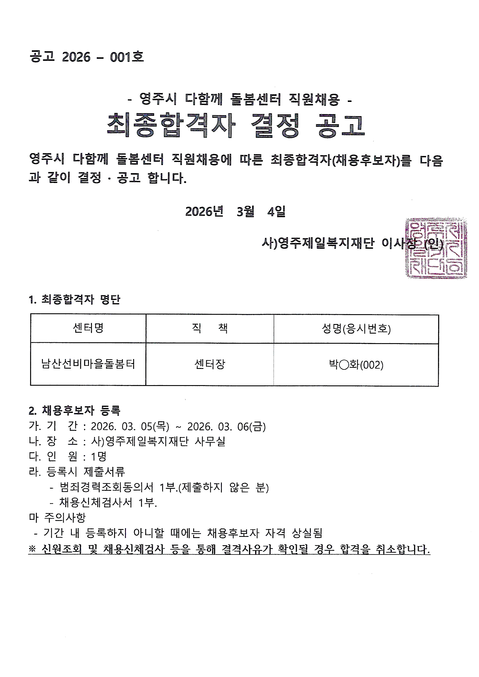 26³â ³²»ê¼±ºñ¸¶À»µ¹º½ÅÍ ¼¾ÅÍÀå ÇÕ°ÝÀÚ ¹ßÇ¥